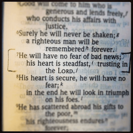 Verse 7 of this Psalm says “He will not fear evil tidings” – the NIV says “He will have no fear of bad news.” This is right after David writes that “For he will never be shaken.”
